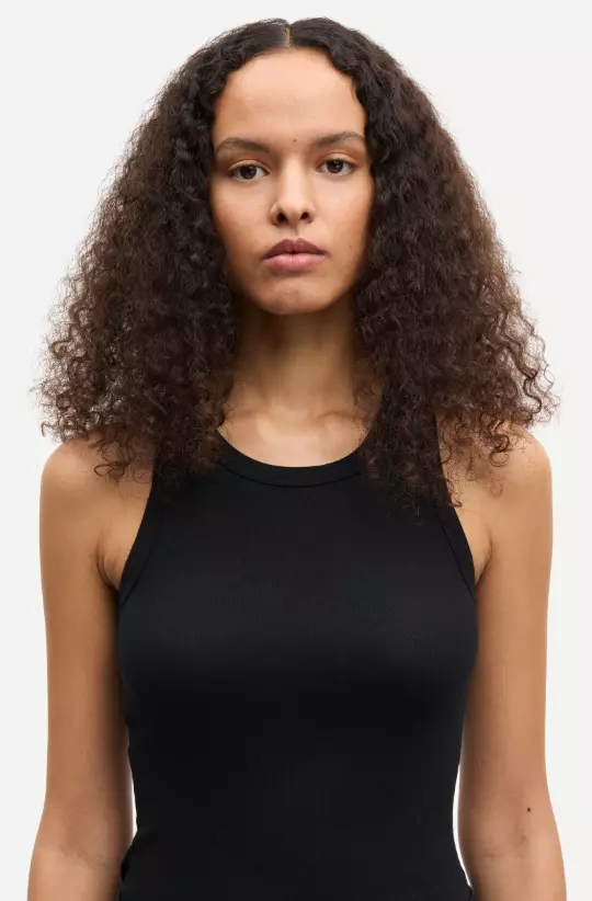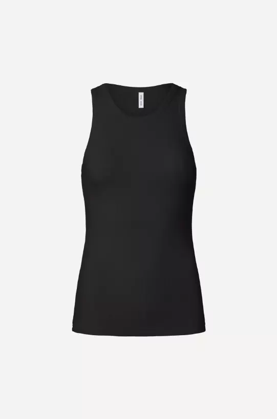 Ribbestrikket tanktopp med smal passform. Hovedmateriale laget av en elastisk økologisk bomullsblanding.
