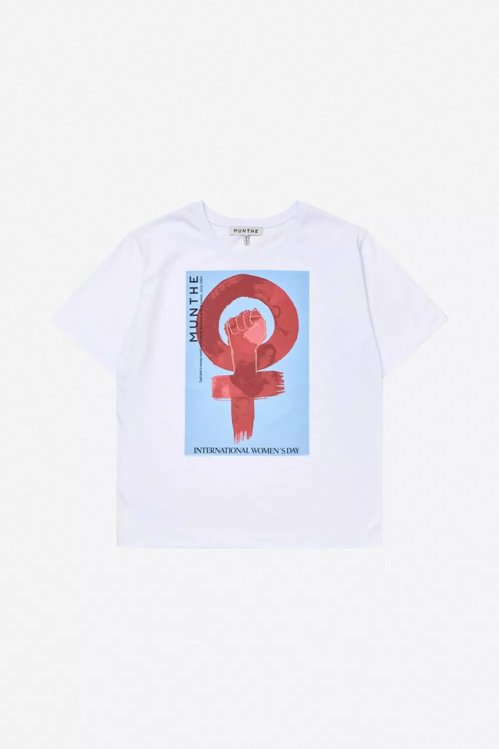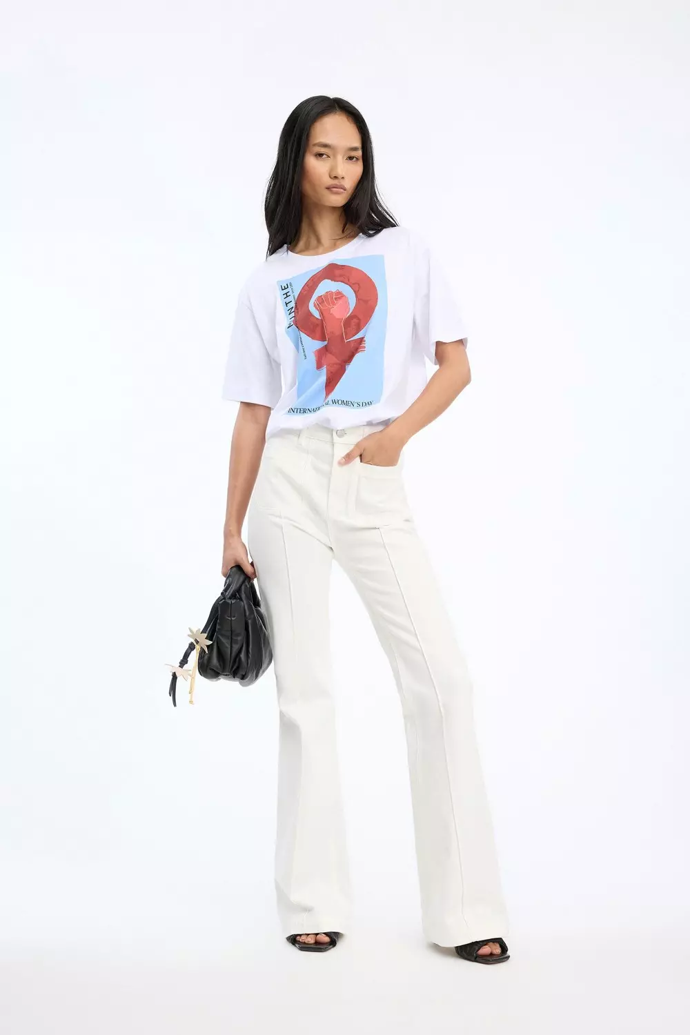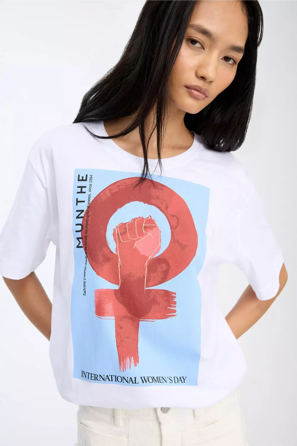 T-skjorte med trykk som feirer den internasjonale kvinnedagen. T-skjorten har en løs passform, rund hals og korte ermer.
