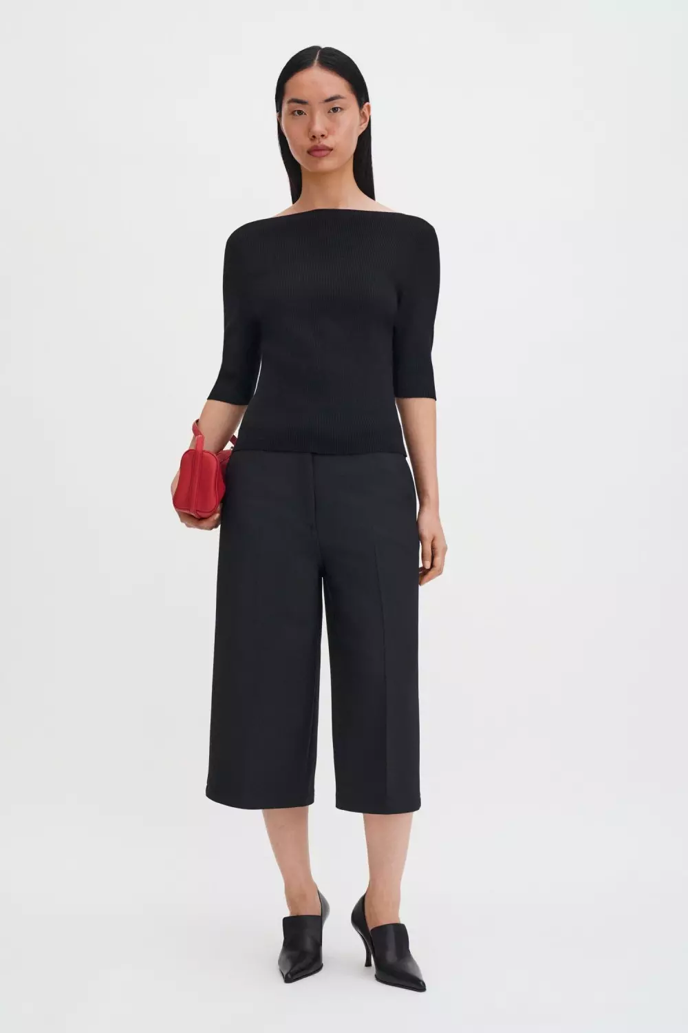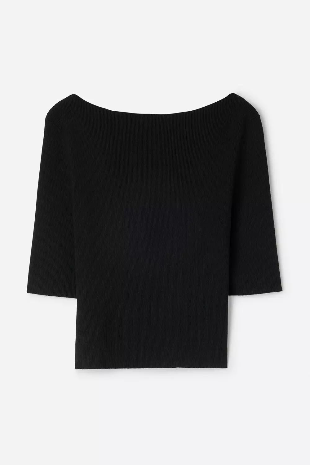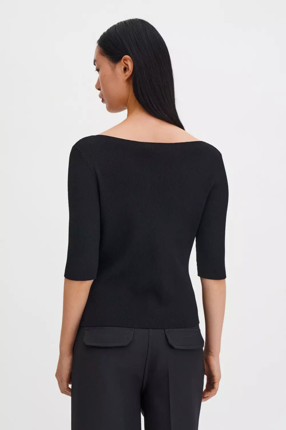 Boatneck Rib Top fra Filippa K. Toppen har båthals og ribbestrikk som er strikket i en lett viskoseblanding med en smal passform. Den har ermer som går til albuen.