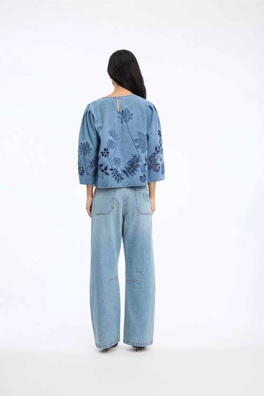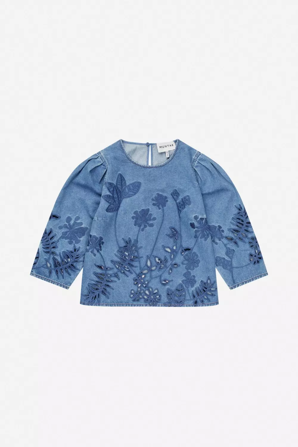 Denimtopp fra Munthe med blomsterbroderi, lange ermer med lett volum, rund hals og vanlig passform.