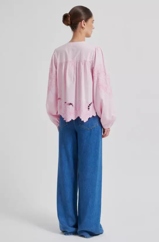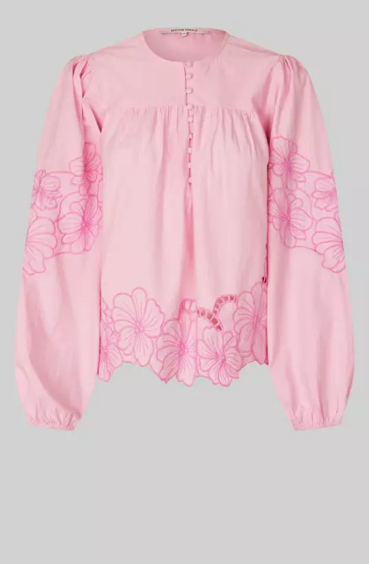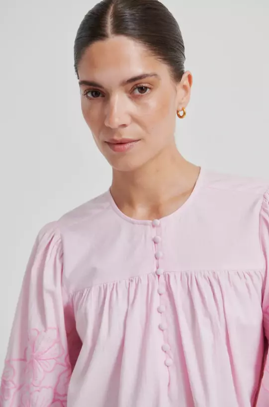 Blusen er laget i lett bomull med broderte detaljer. Har rund hals og trukket knappelukking. Samlede skuldre og elastiske mansjetter som skaper en puffet form. Kamskjellkant nederst. Løs passform.