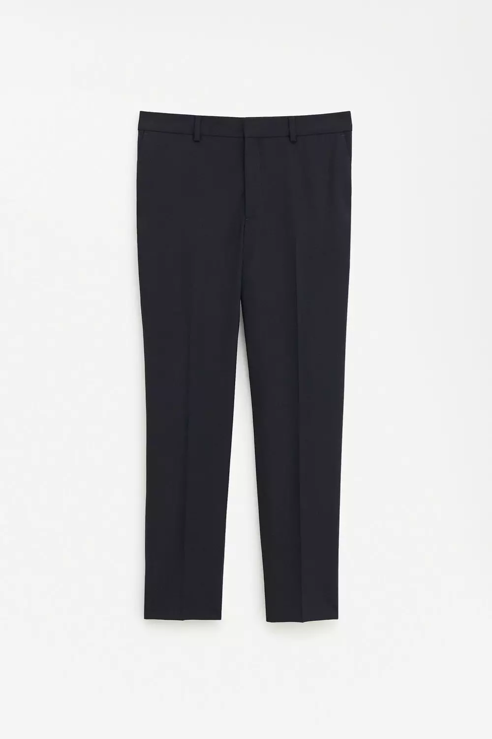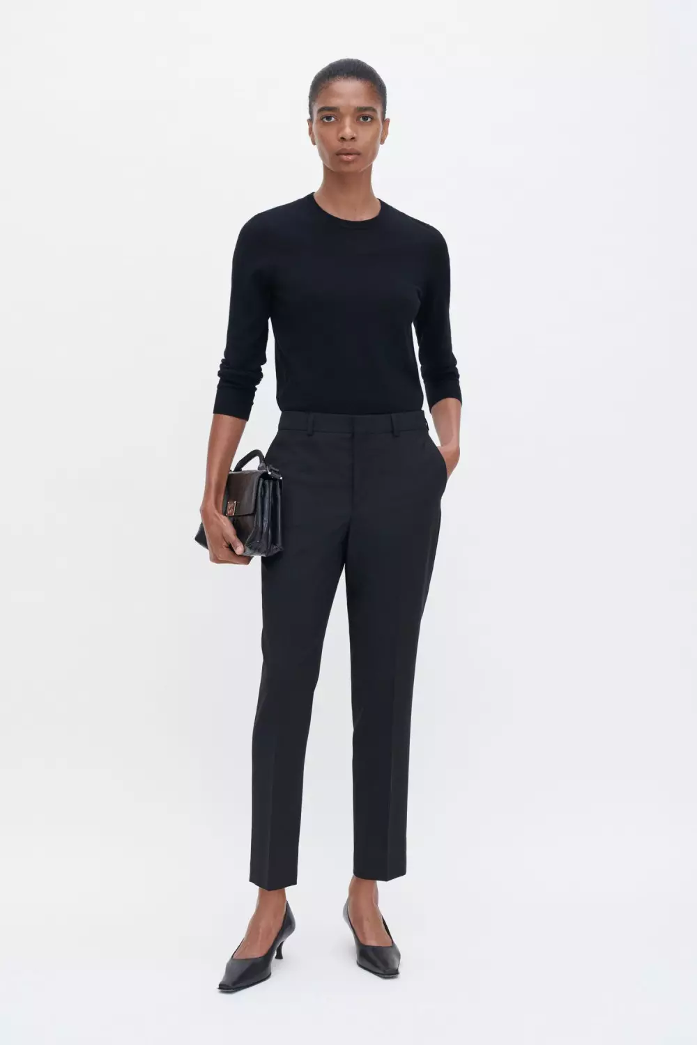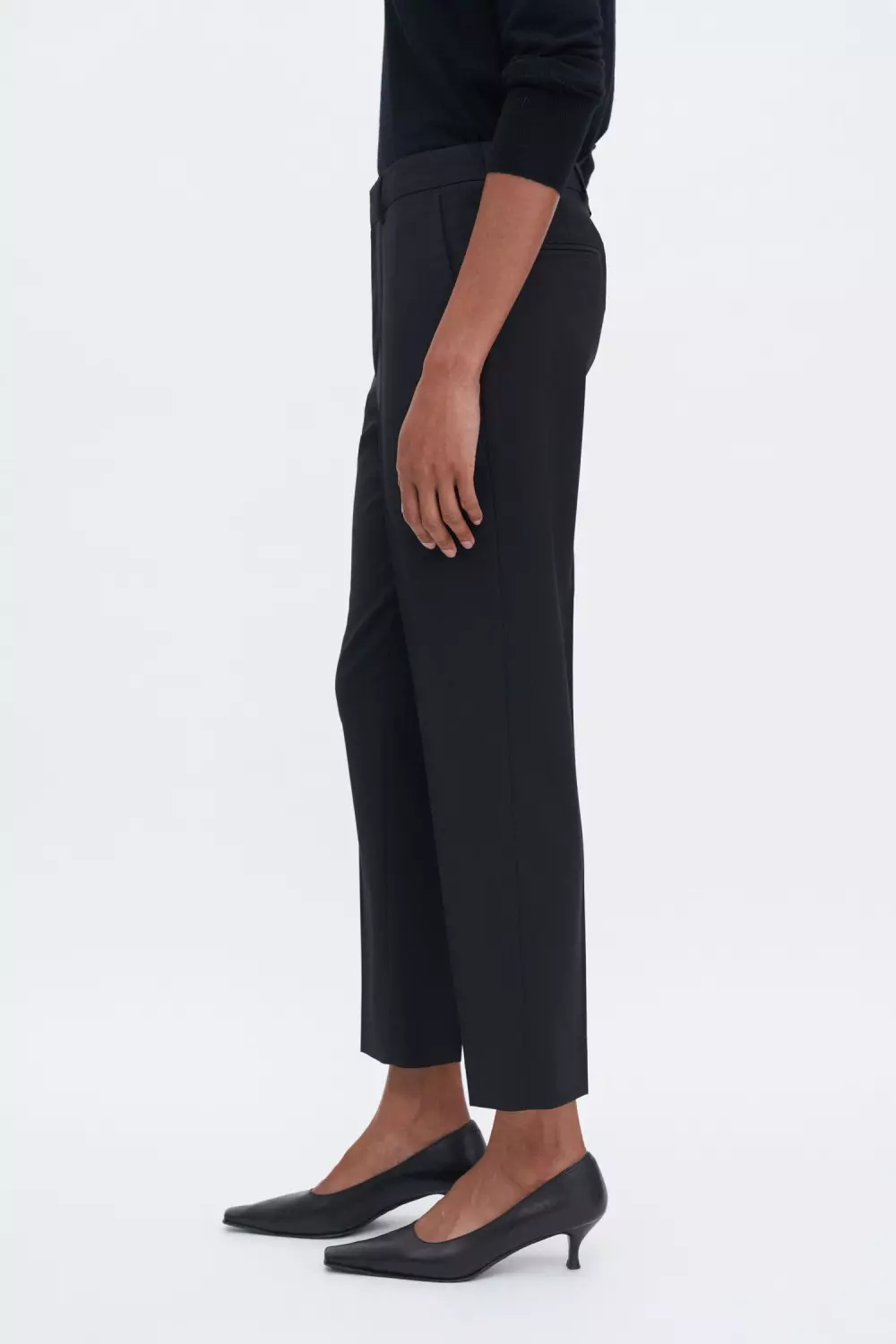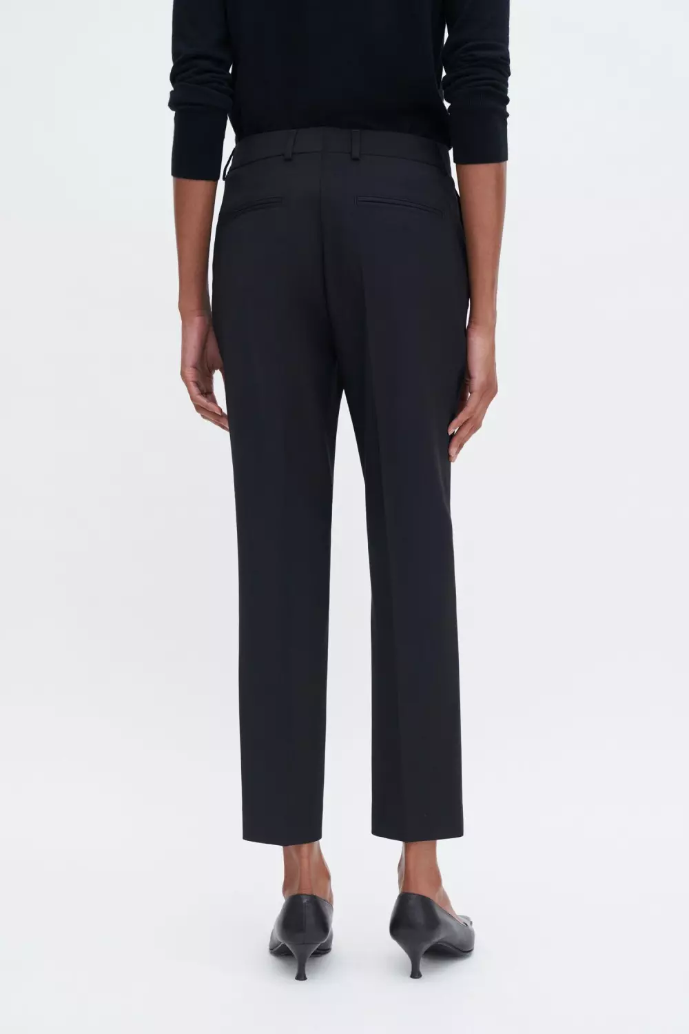 Emma Cropped Cool Wool Trouser, dressbukser fra Filippa K. Vanlig passform, middels høy midje og en kort lengde som smalner litt av nedover kanten. De er laget av pustende merinoull med lett stretch. Bruk dem med Sasha Cool Wool Blazer for et fyldig dressutseende.