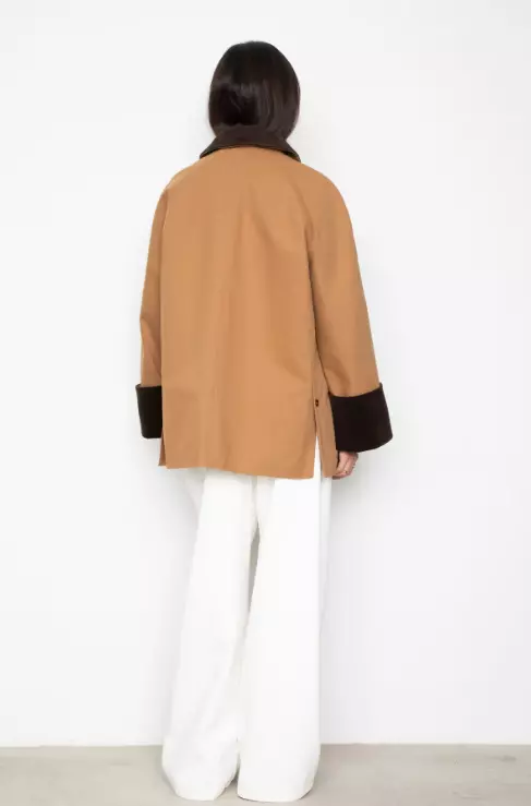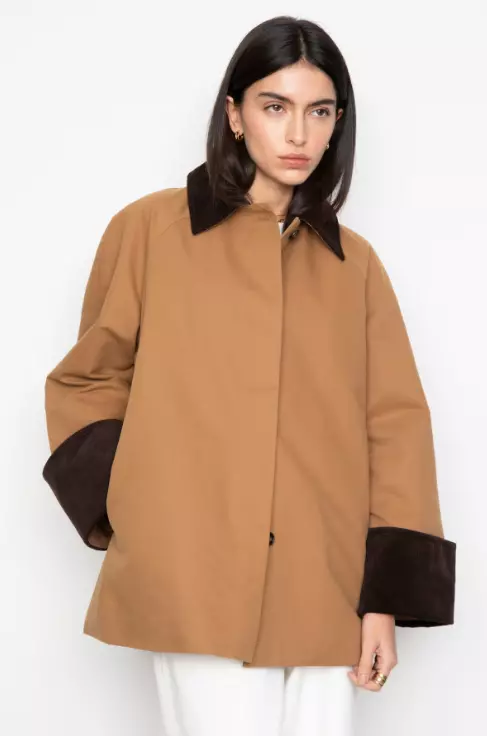 Heather Jacket er laget av en vannavvisende bomullsblanding, perfekt for vårvær. Designet for en avslappet passform med raglansnitt og polstret fôr for komfort. Jakken har en mørkebrun kordfløyelskrage og mansjetter, skjulte knapper foran og er detaljert med høye sidesplitter bak for enkel bevegelse.