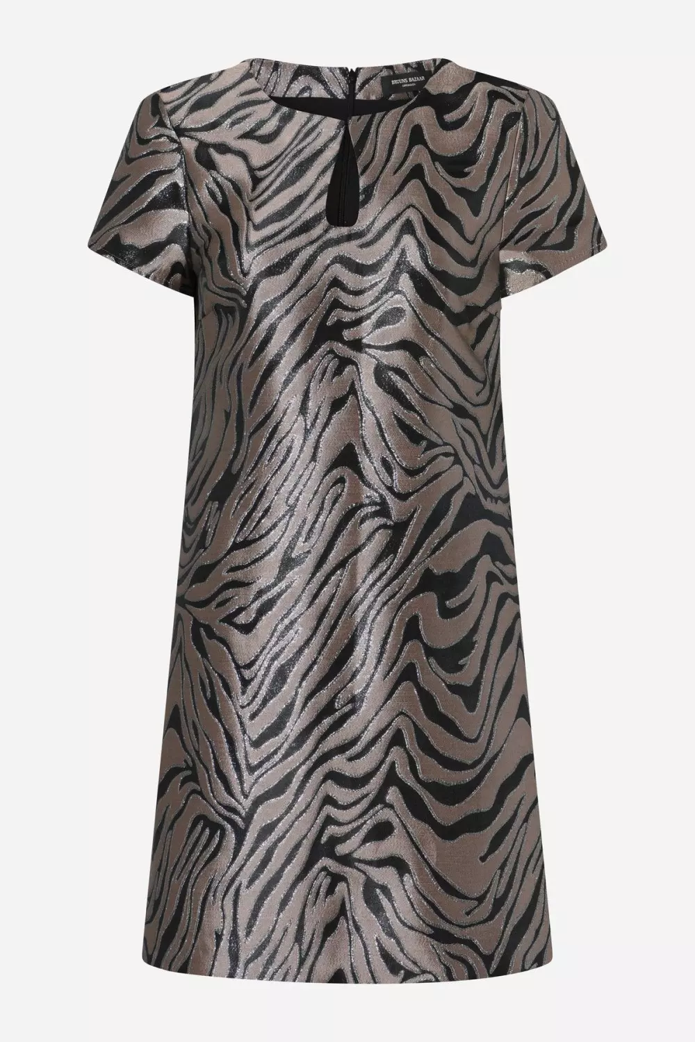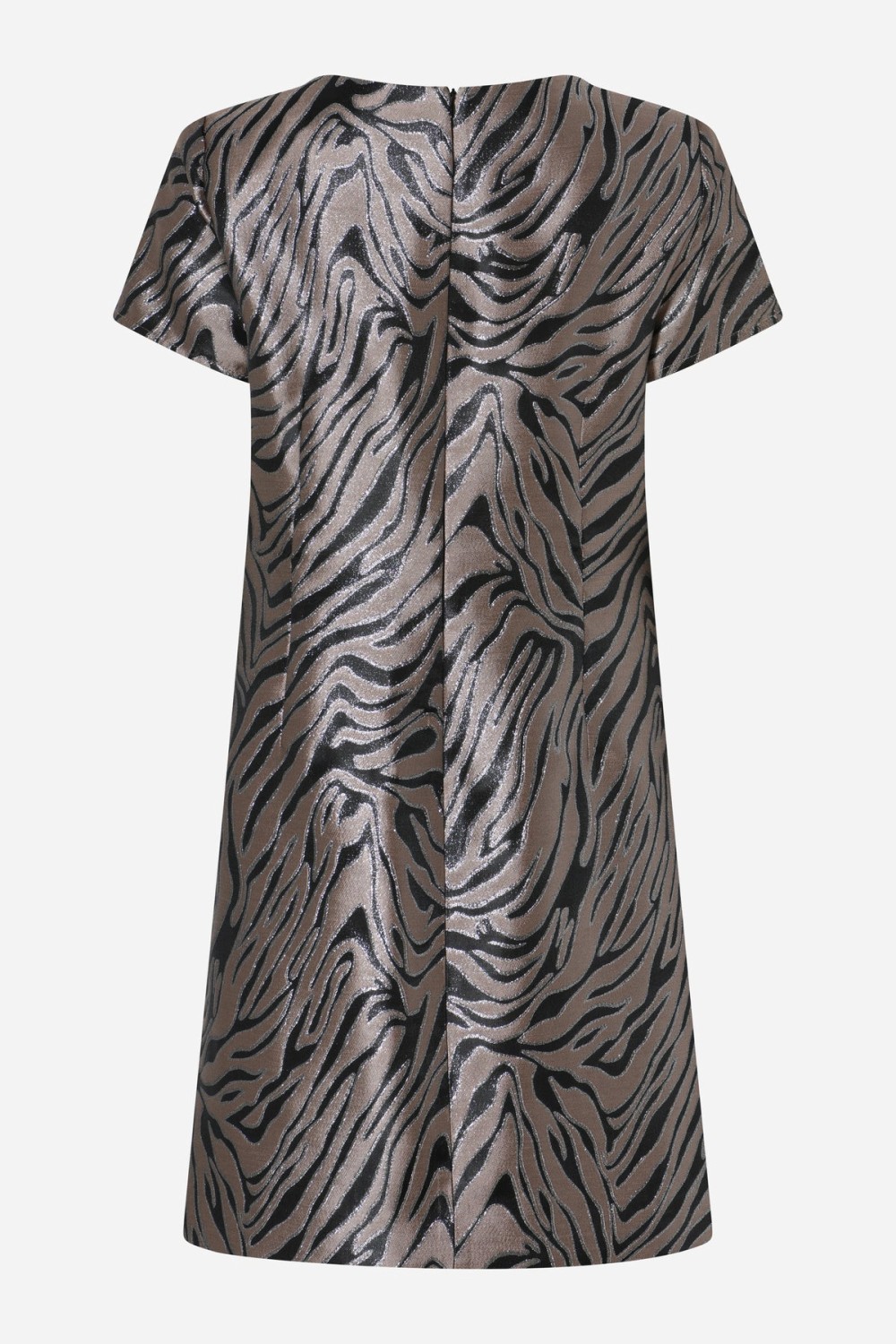 KousaBBTereni er en kort kjole med en lett tettsittende silhuett, rund hals og korte ermer. Metalltrykket gir designet gnist og eksklusivitet.