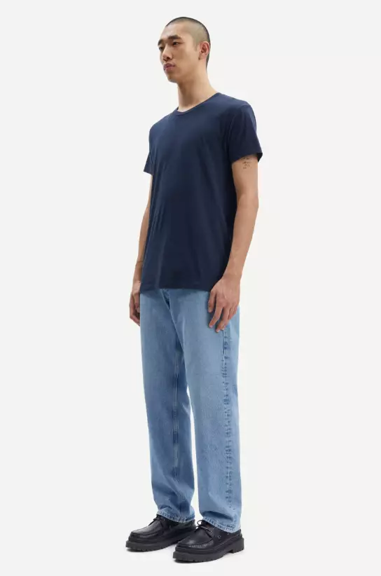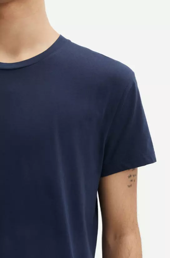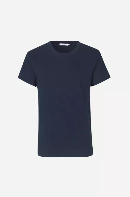 T-skjorte fra Samsøe Samsøe. Den har en innvendig søm i halsen og dobbeltnålssøm i mansjett og fald. Et godt basisplagg.