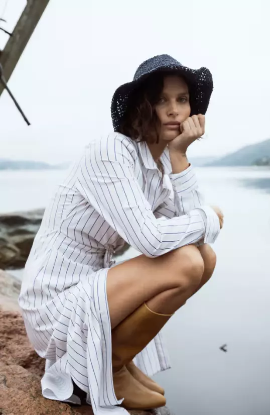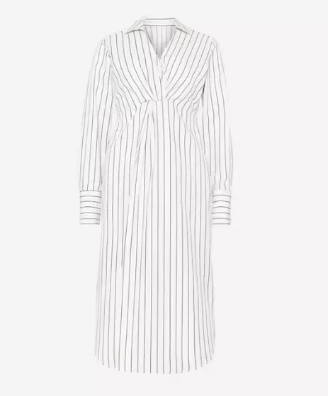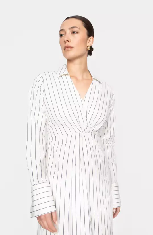 Livia Dress er en mellomlang skjortekjole med en knutedetalj foran i midjen. Laget av skarp bomullstwill i en ny sesongstripe, den har en buet kantlinje med sidesplitter for ekstra bevegelse. De lange ermene er avsluttet med doble mansjetter, og en skjult glidelås i siden sørger for god passform.