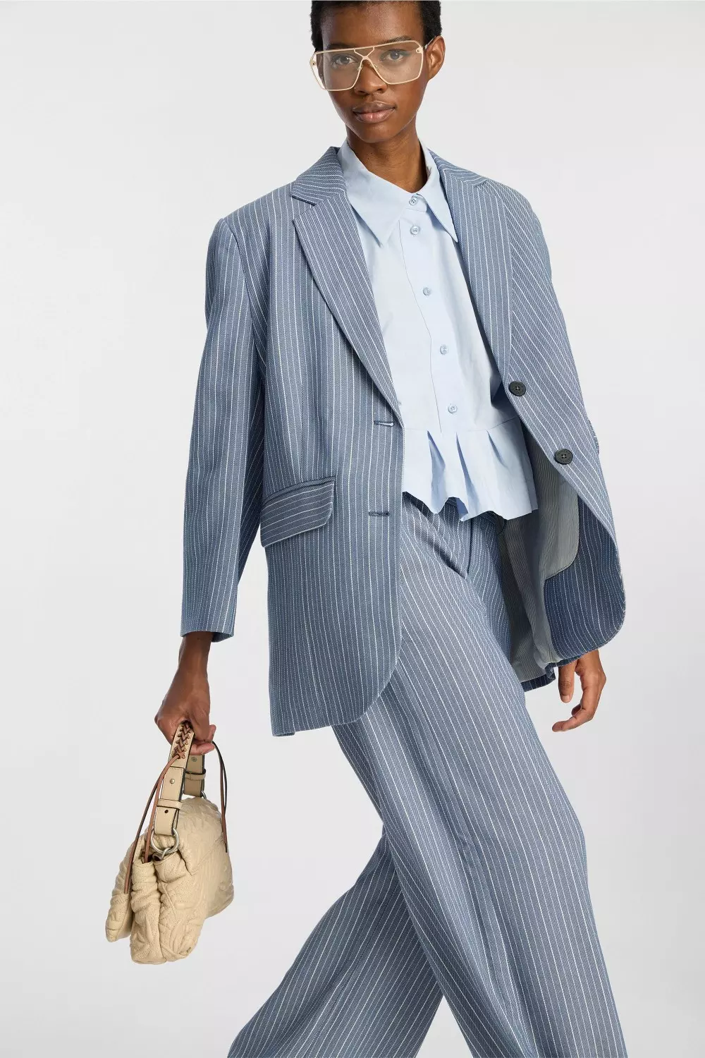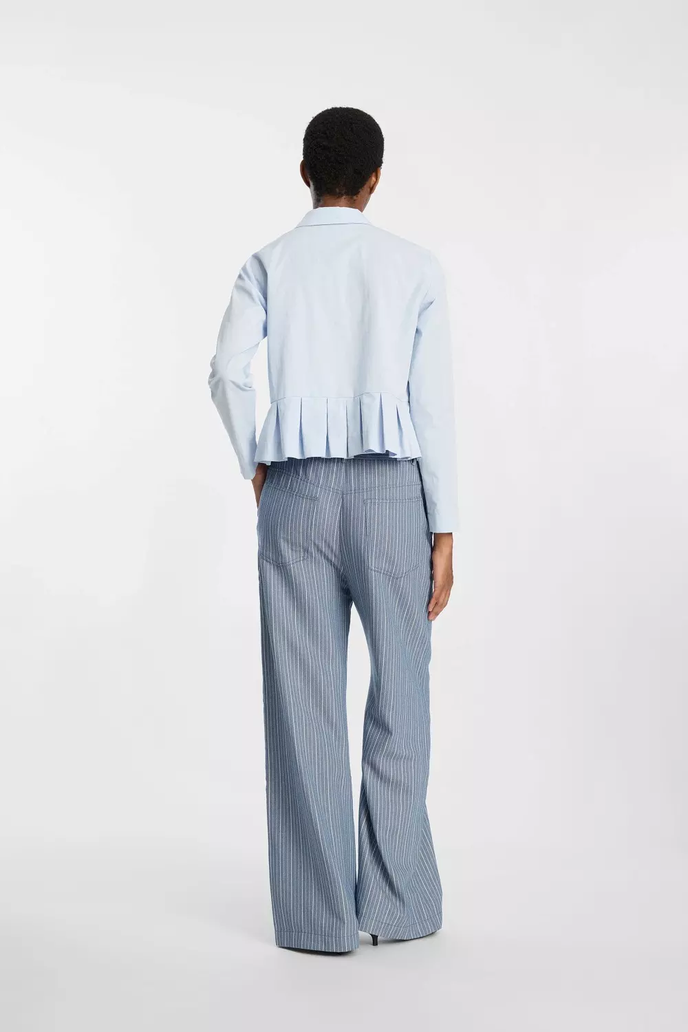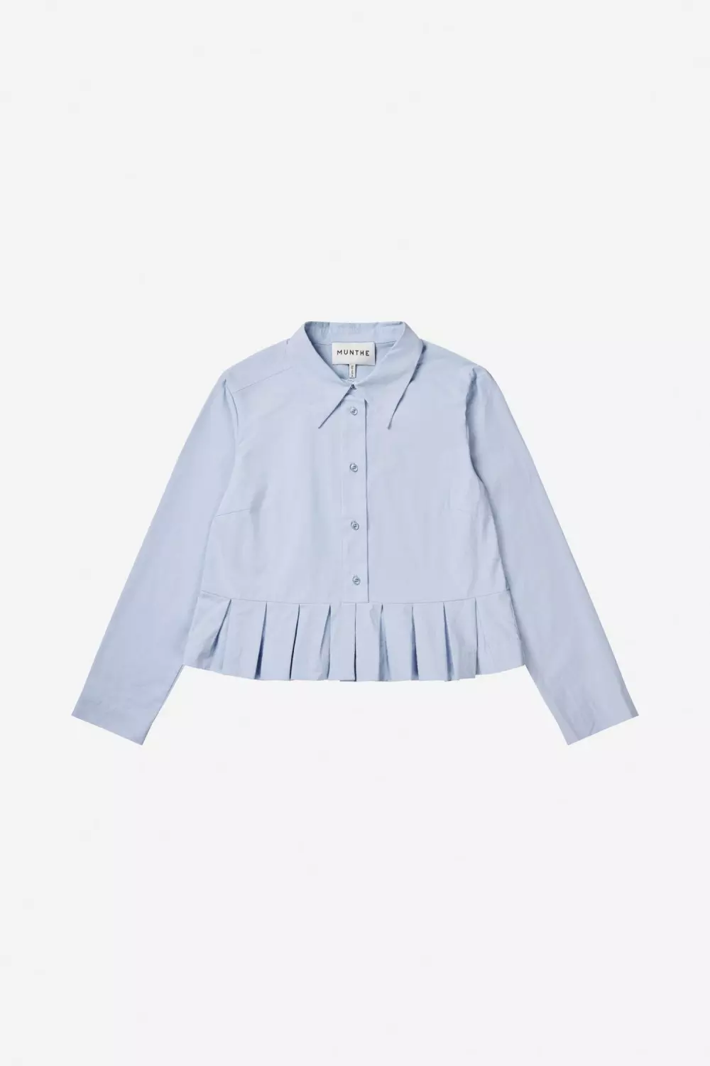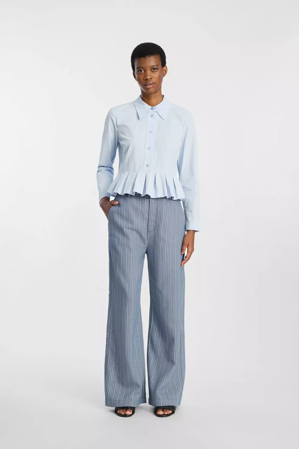 Skjortebluse med knapper, krage og en elegant peplumdetalj nederst. Blusen er designet med lange ermer.