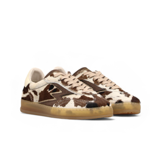 Club Deluxe Cow Print Horsy Brown Logo Ivory Details sneakers fra Moaconcept. Modellen er laget i Italia med ovedel i skinn med kumønster, brun skinnlogo og hvit hælkappe. Blanding av semsket og glatt skinn. Innerspåle er i skinn og yttersåle i 3,4 cm gummi.