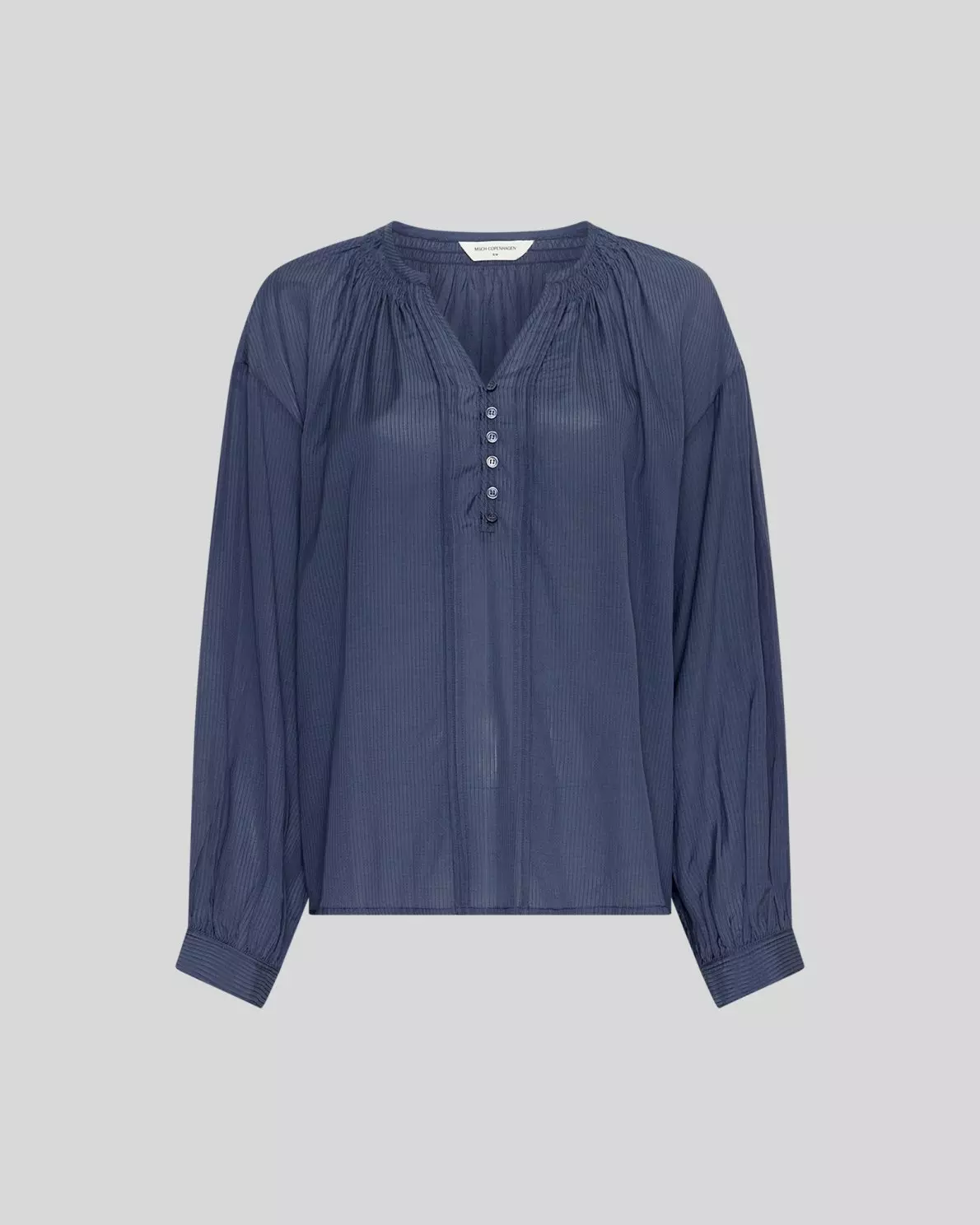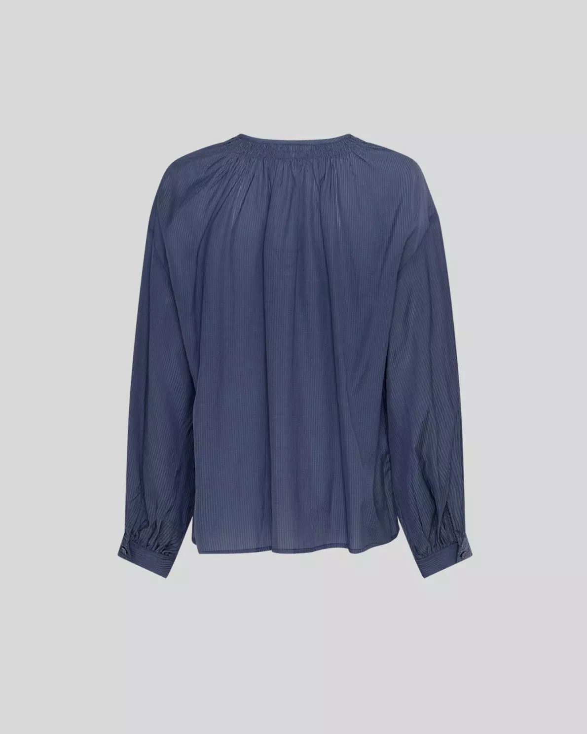 Lett og elegant bluse med myk struktur i stoffet og fine folder på skuldrene, noe som gir et feminint og avslappet utseende. Blusen har en lett gjennomsiktighet og en komfortabel passform, noe som gjør den ideell for både hverdag og mer formelle anledninger.