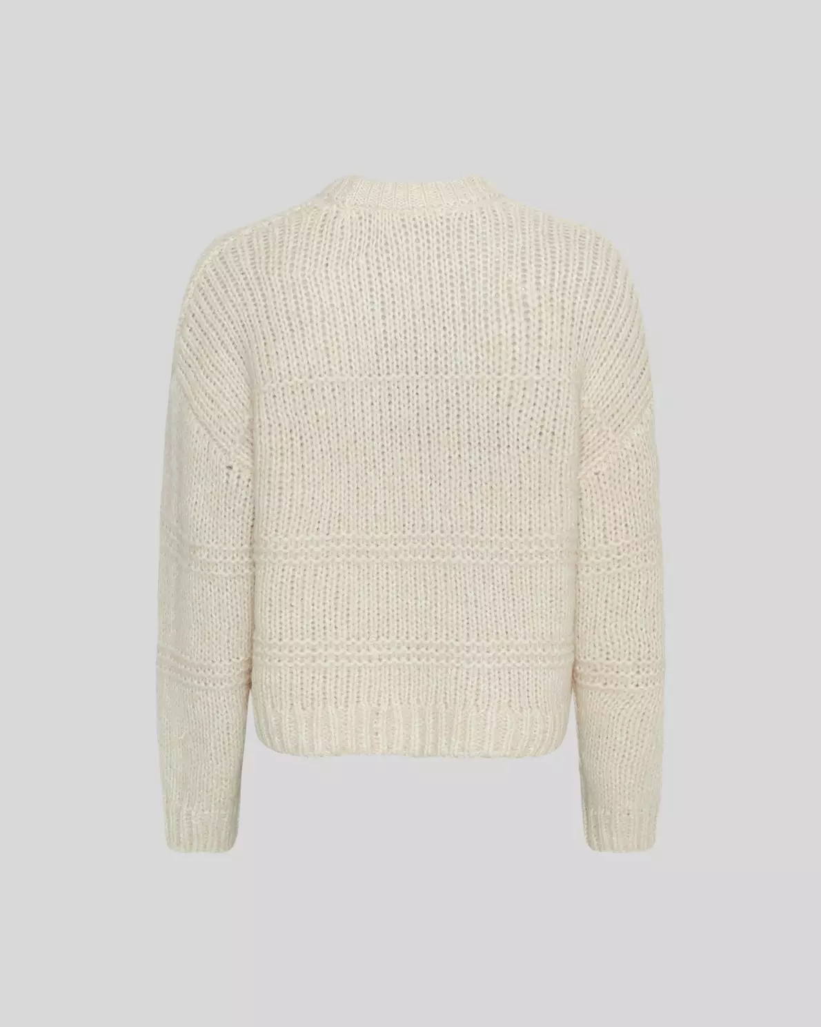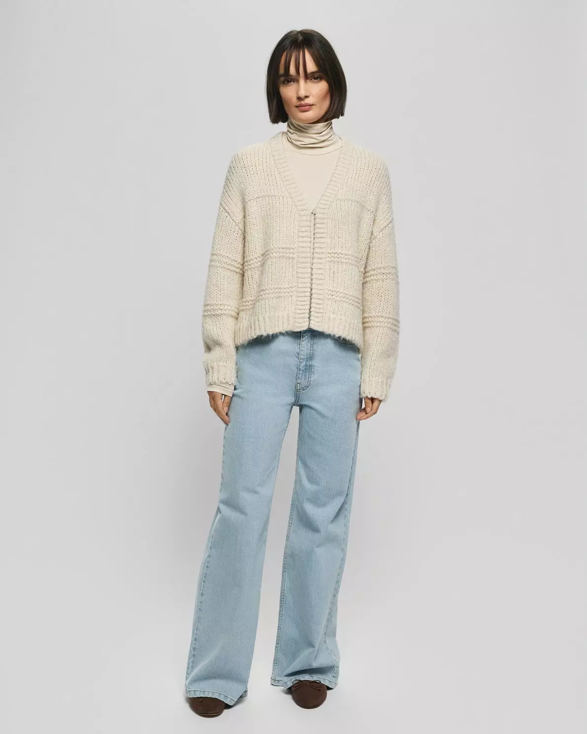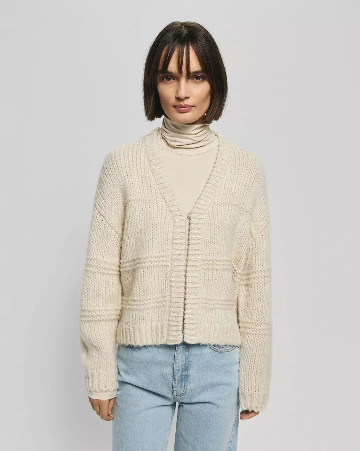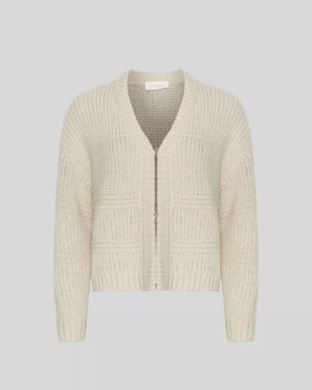 Denne strikkede cardiganen fra MSCH Copenhagen er designet i en myk og strukturert kvalitet med et avslappet, moderne utseende. Cardiganen har V-hals, lange ermer og en litt kort lengde, noe som gjør den ideell både for lag-på-lag og som et frittstående statement. En tidløs stil som enkelt kan pyntes opp eller ned.