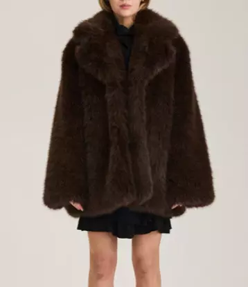 North Faux Fur Jacket fra Ravn Ravn. En luksuriøs statementjakke i mørkebrun fuskepels som tilfører antrekket en sofistikert retrofølelse. Jakken har en oversized passform med sjalkrage og brede ermer som skaper et dramatisk, men samtidig elegant uttrykk. Den myke, fluffy teksturen gir både komfort og varme – perfekt for å holde stilen på kalde dager.