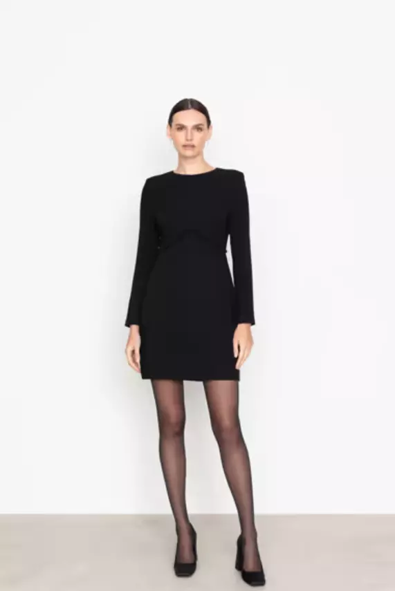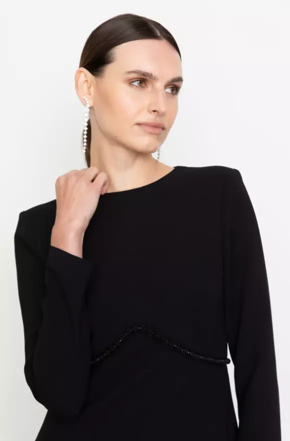 Portia Dress tilbyr et klassisk, raffinert utseende med sin runde hals og polstrede skuldre. Midjekanter med perler og lange ermer gir et luksuriøst preg.