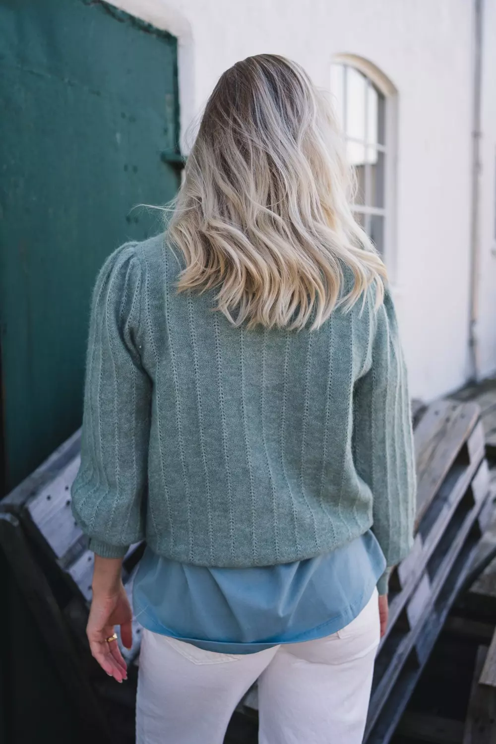 Amalie Puff Pullover er en nydelig strikk fra Raus, og et must-have plagg i garderoben! Den har feminine detaljer og kommer i en vakker grønnfarge som gir et friskt og elegant uttrykk. Genseren er strikket i en myk ullblanding med ribb-kanter og et delikat mønster som gir den et unikt uttrykk. Den har rund hals, mansjetter med dekorative knapper og en avslappet passform.