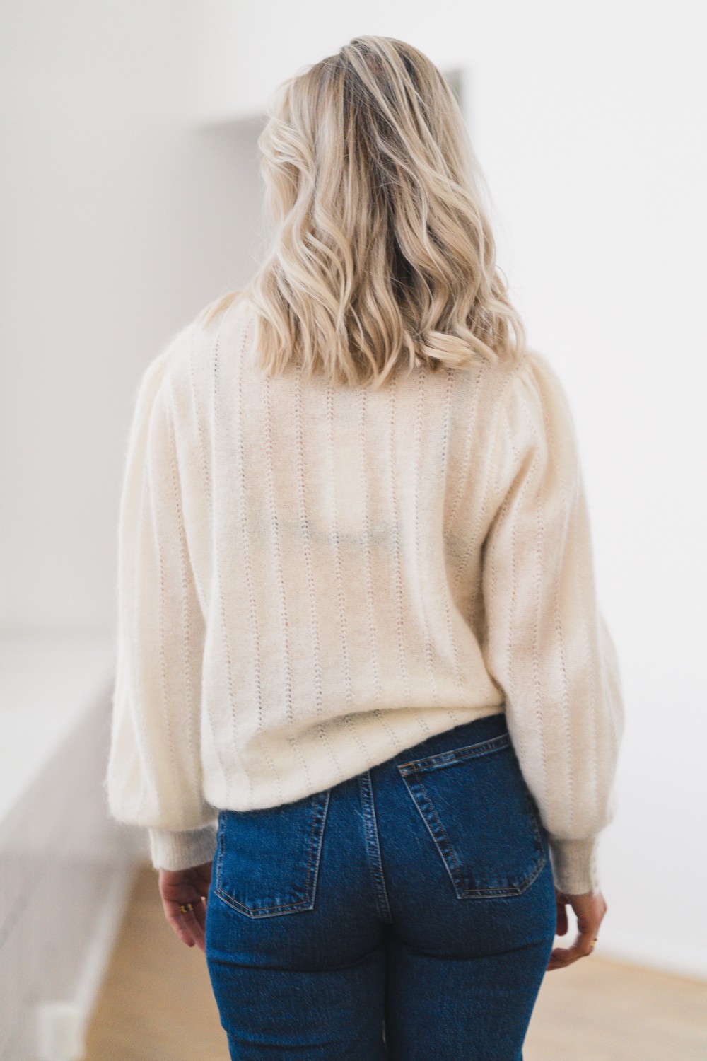 Amalie Puff Pullover er en god strikkegenser fra RAUS. Den kommer i en superdelikat kvalitet og har klassisk offwhite farge. Genseren kommer med ribbende kanter og er strikket i et delikat mønster. Den har rund hals, mansjetter med dekorative knapper og en avslappet passform. Et must-have-plagg til garderoben.