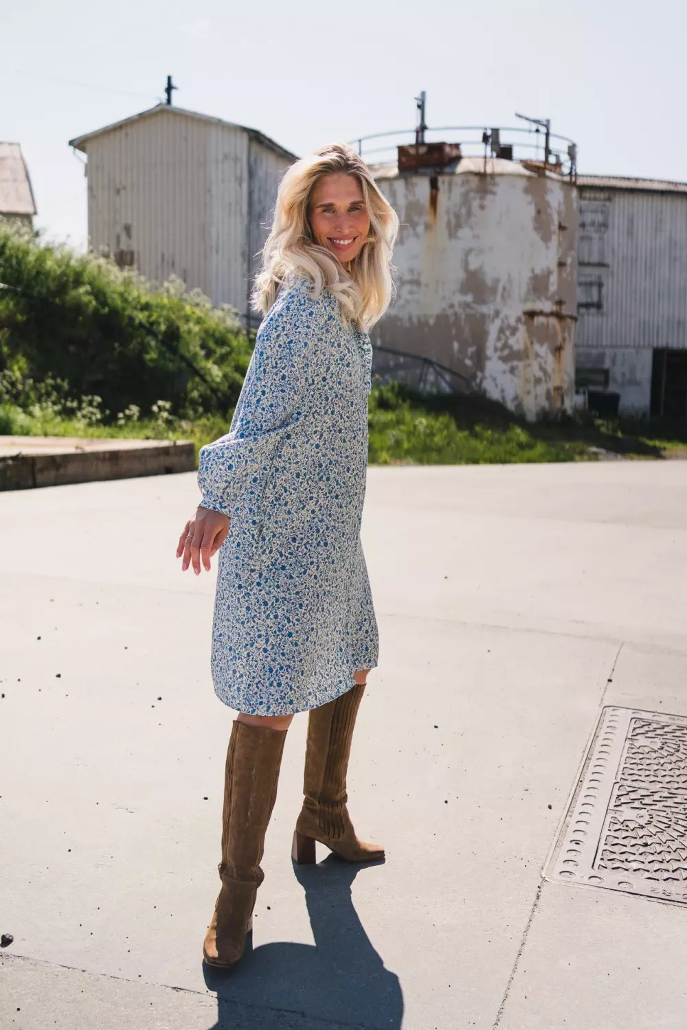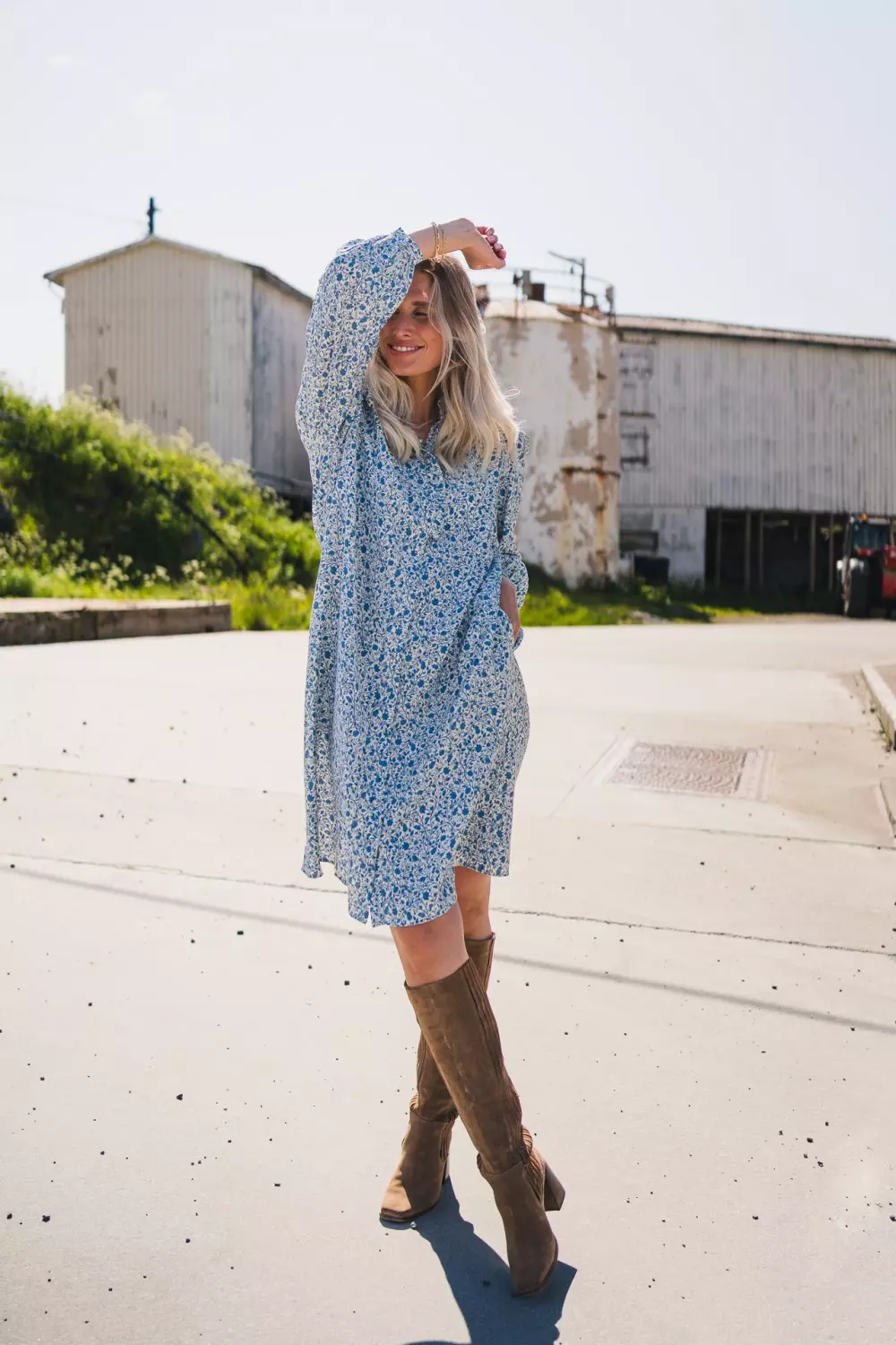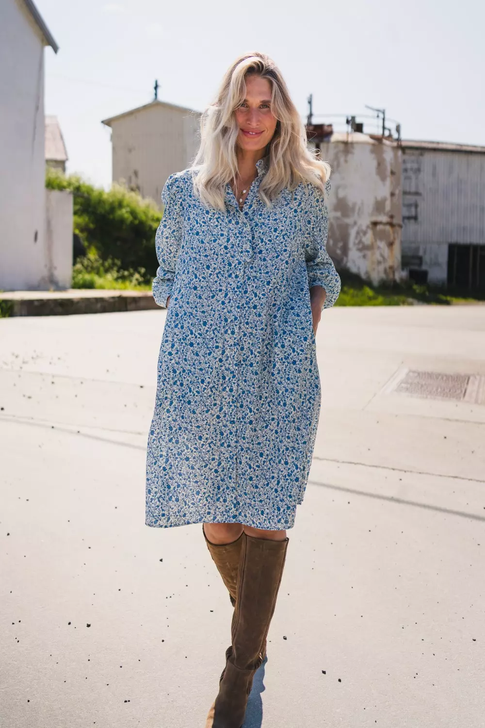 Gry Astrid Shirt Dress er den ultimate vår og sommerkjolen fra Raus, og et must-have i garderoben! Kjolen har en flatterende kort lengde og lange ermer, samt en markert midje med strikk bak som fremhever figuren. Den søte prestekragen med volanger og de delikate knappene i kragen gir kjolen et lekent og feminin preg. Det vakre blomstermønsteret i blått gir et friskt og elegant uttrykk. Kjolen er laget i en viskosemiks som føles meget myk og behagelig på. Lommer i sidene.