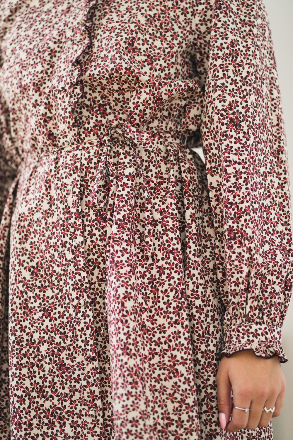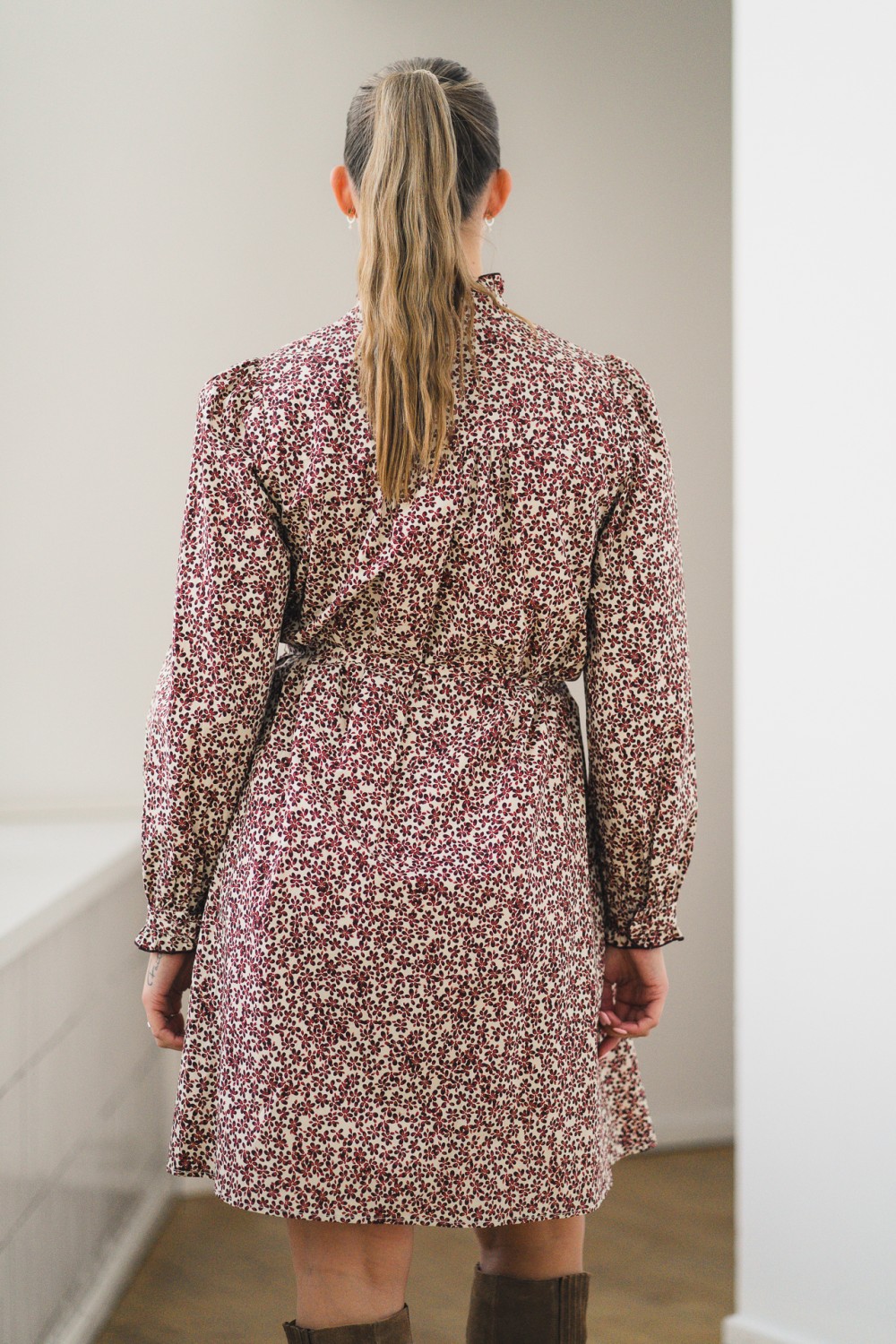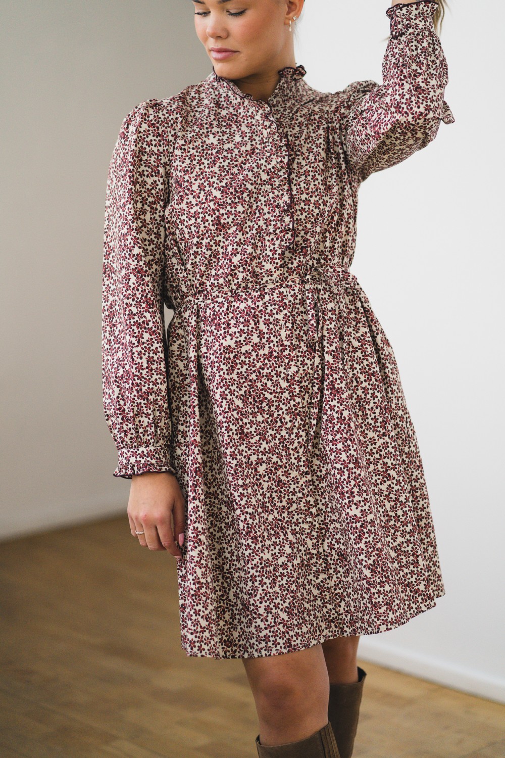 Maja Shirt Dress er en nydelig kjole fra Raus som er et must-have i garderoben. Den har en avslappet passform og mini-lengde, og kommer med et avtagbart knytebånd som gir mulighet for en mer definert silhuett. Kjolen er dekorert med en søt prestekrage med volanger og små knapper i halsen, som gir et delikat og sjarmerende uttrykk. Det vakre blomstermønsteret i burgunder og offwhite bunnfarge gir et friskt og elegant uttrykk. Med sin gode kvalitet vil denne bli en favoritt!