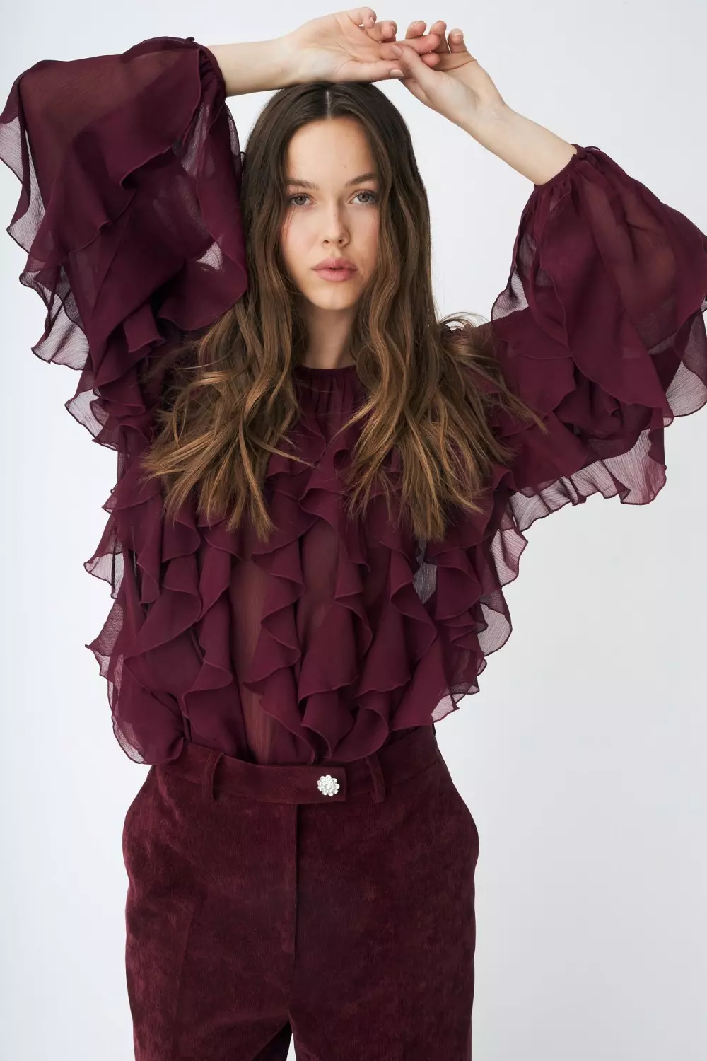 Rya Cras Blouse fra CRAS blander romantikk og moderne feminitet på en perfekt måte. Det delikate, gjennomsiktige stoffet gir et lett og luftig utseende, mens de vakre rysjedetaljene og stoffkledde knappene gir et eksklusivt preg. De lange ballongermene samles elegant ved mansjettene med knappelukkinger, noe som fremhever blusens grasiøse silhuett. En tidløs stil som fungerer like bra til festlige anledninger som til hverdagsbruk.