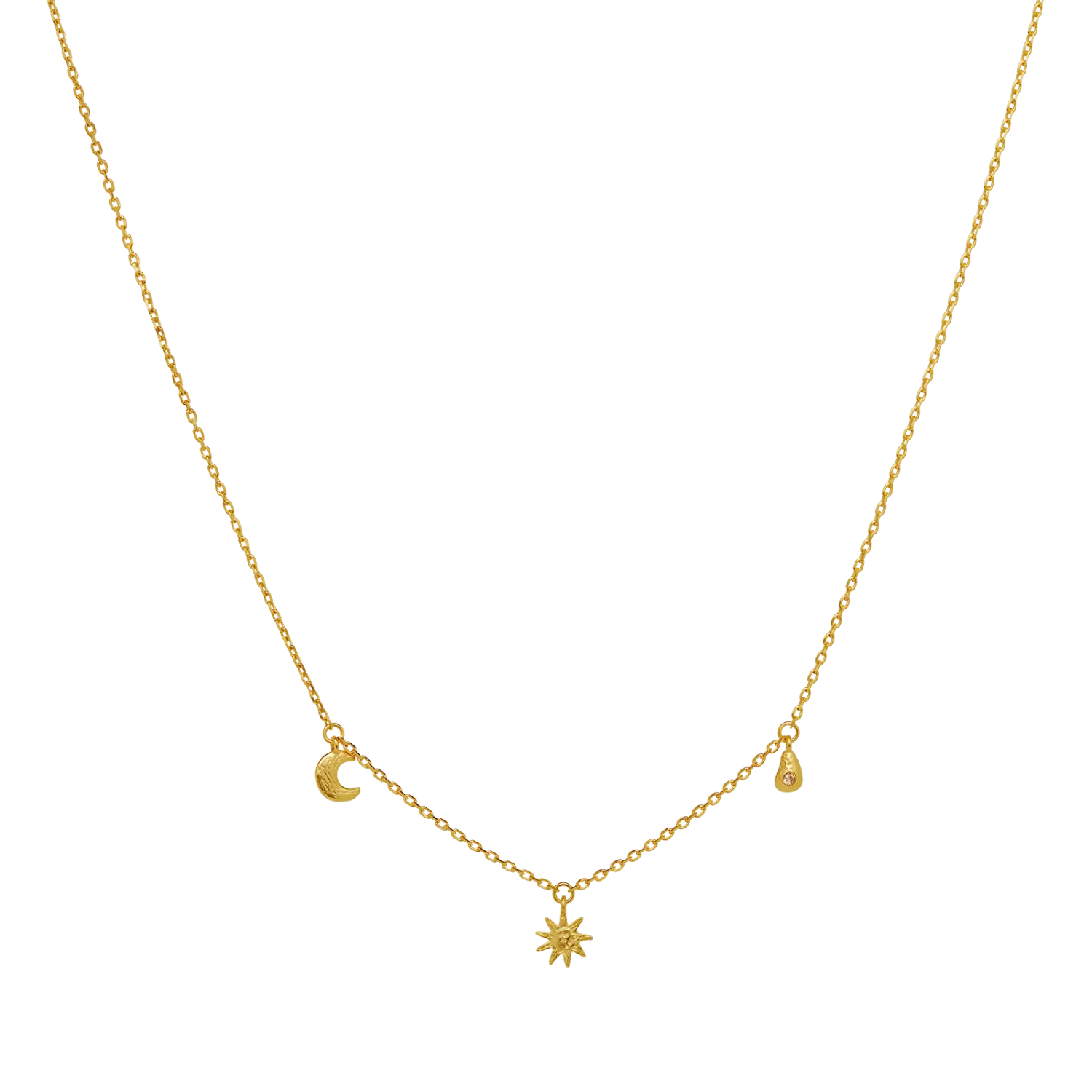 Den flytende og fint balanserte symbiosen mellom dag og natt gjenspeiles i vårt Sadie halskjede. Her forenes sol og måne i en enkelt dråpe, som duggen som dannes i måneskinnet for så å bli slukt av solen ved daggry. Materialer: Resirkulert sterlingsølv (925) belagt med 18K gull, champagnefargede zirkonia.