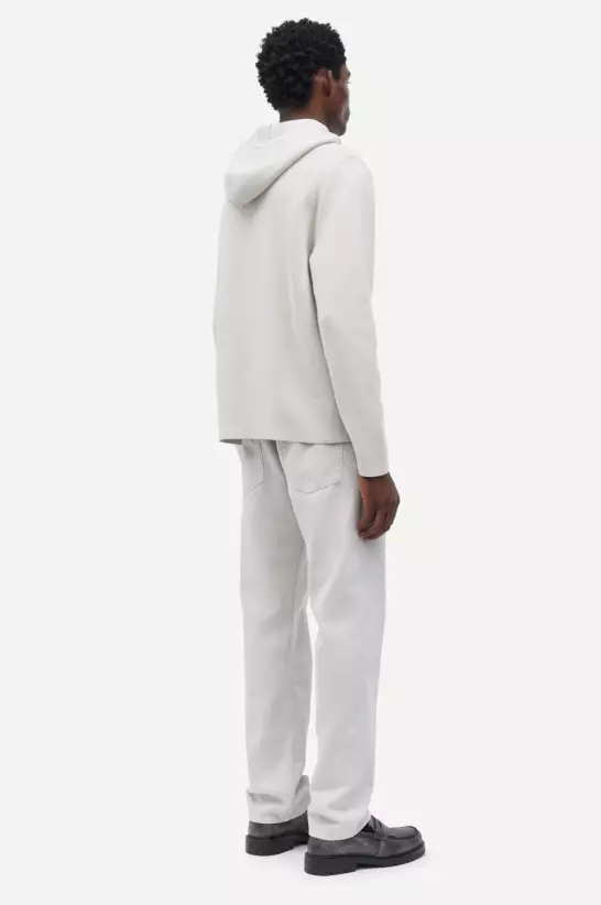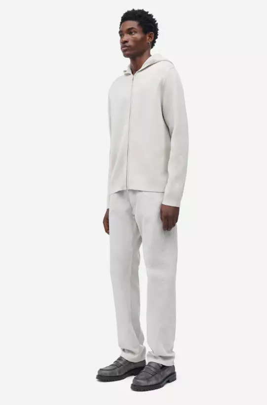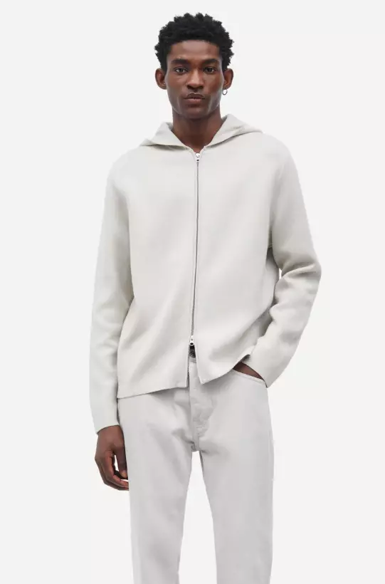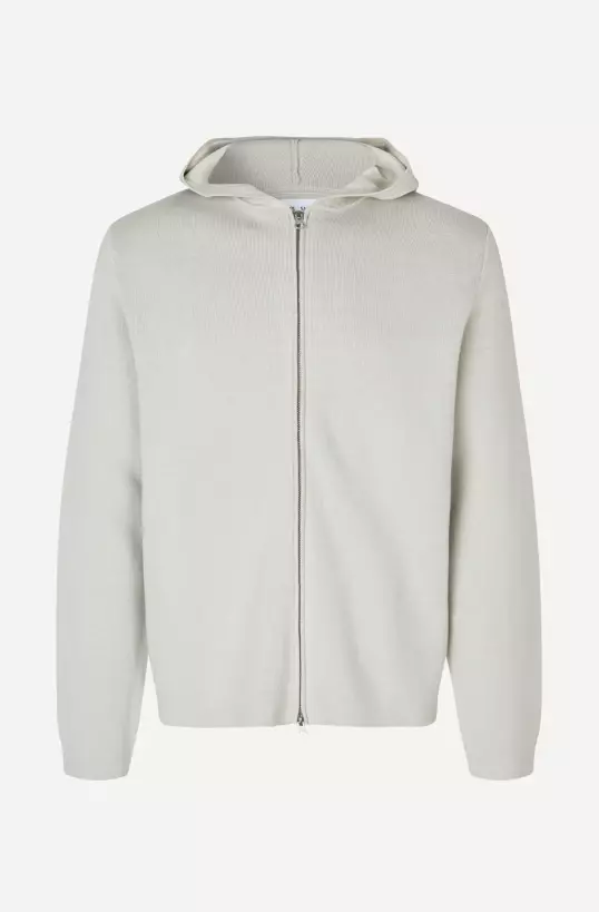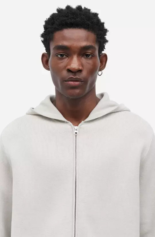 Strikket hettegenser med vanlig passform. Toveis glidelåslukking foran. Hovedmateriale laget av en blanding av økologisk bomull.