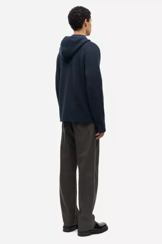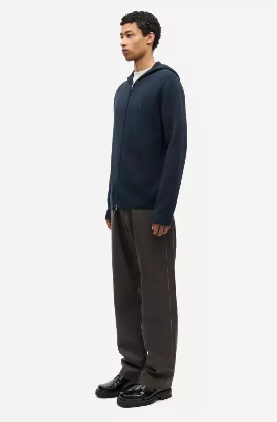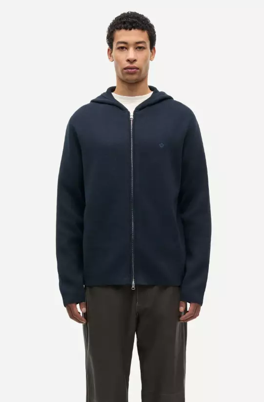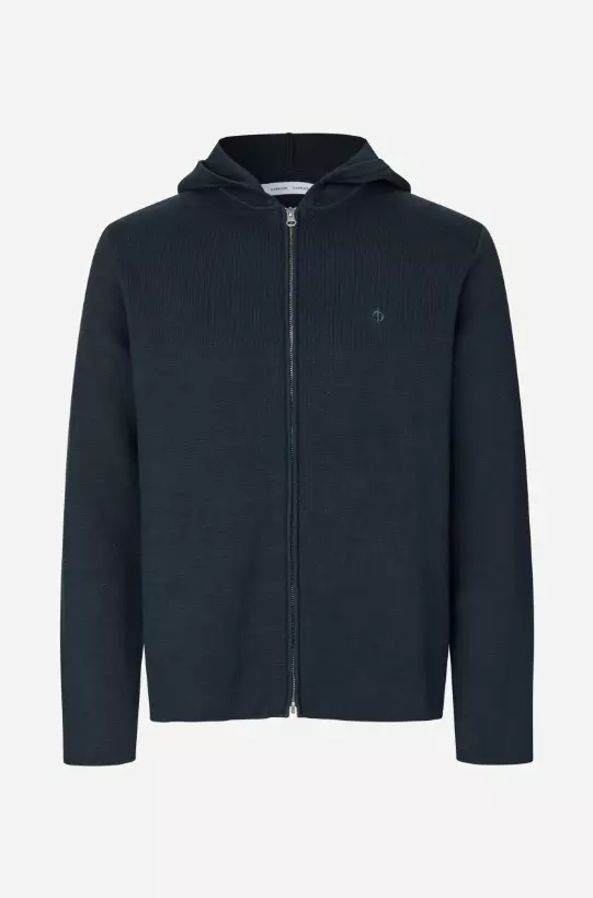 Strikket hettegenser med vanlig passform. Toveis glidelåslukking foran. Hovedmateriale laget av en blanding av økologisk bomull.