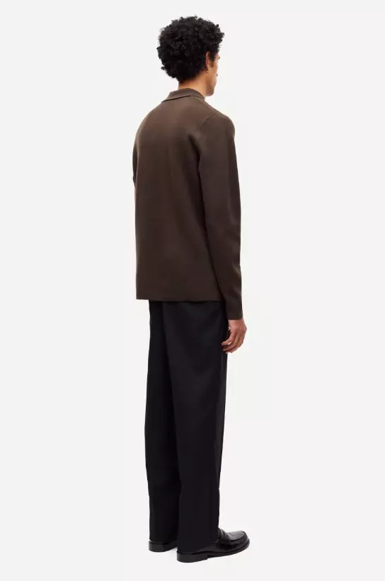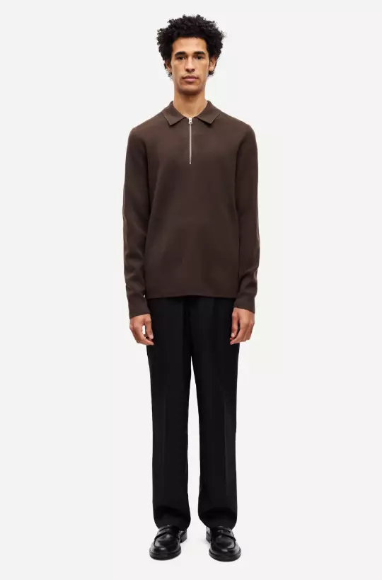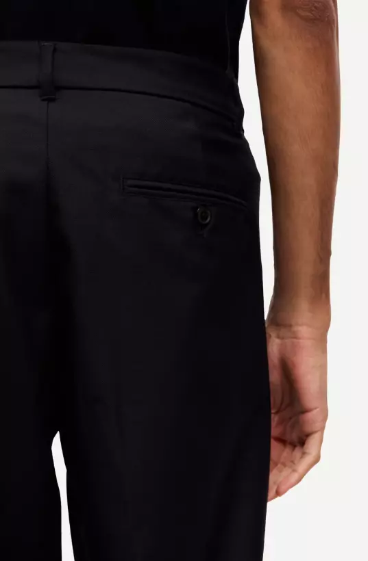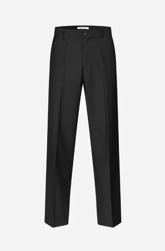 Bukser med vanlig passform og vide ben. Knapp- og glidelåslukking i gylfen. Stikklommer foran og passpolerte lommer med knapp bak. Beltehemper. Pressede legg foran og bak. Hovedmateriale laget av en blanding av resirkulert polyester og ull.