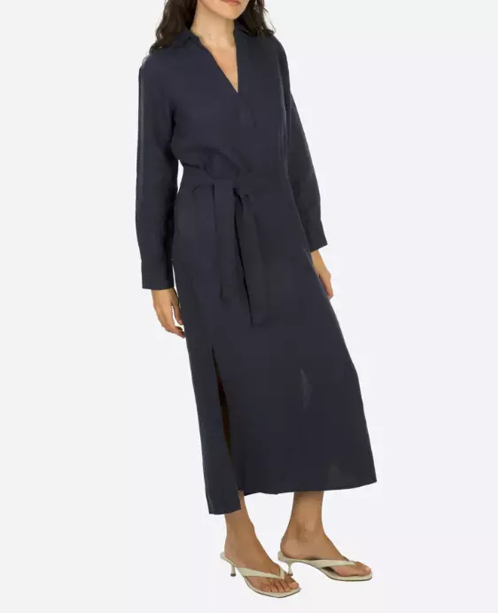 Kjolen er laget av 100% lin. Dette er en langermet kjole med v-krage og kommer med belte.