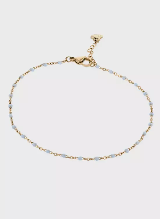 Blue Bead Anklet i 14K PVD-belagt rustfritt stål har blå emalje-aksenter, som tilfører en fargetone og en elegant touch til stykket. Kombinasjonen av rustfritt stål og emalje skaper et elegant, moderne design.