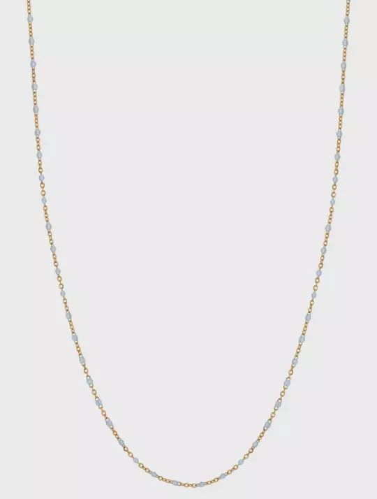 Det blå perlekjedet i 14K PVD-belagt rustfritt stål har blå emaljeaksenter, som tilfører en fargetone og en elegant touch til stykket. Kombinasjonen av rustfritt stål og emalje skaper et elegant, moderne design.