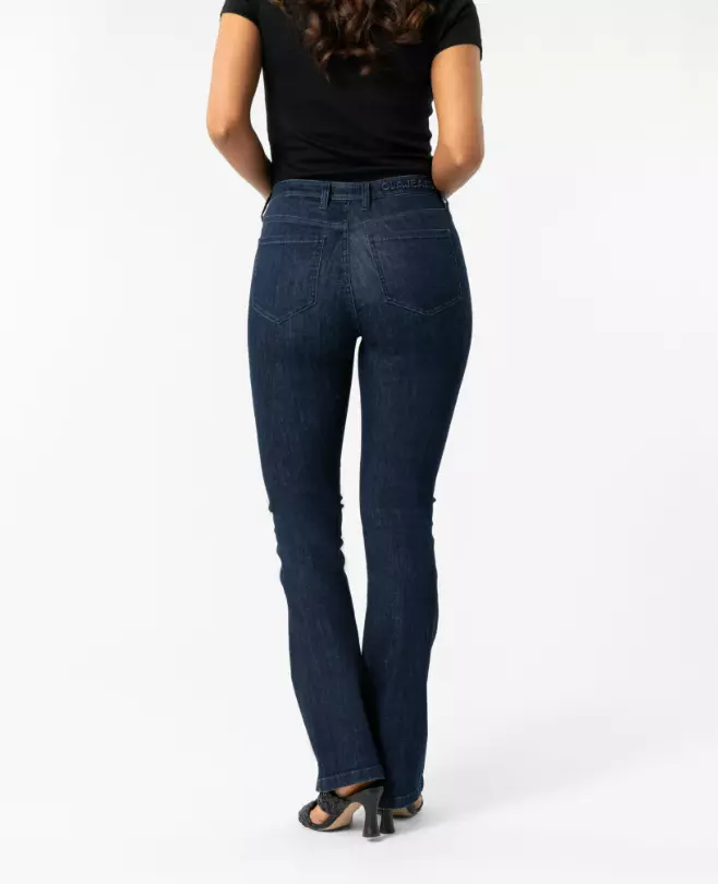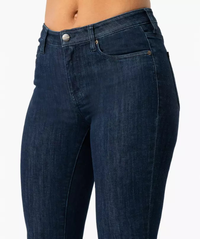 Denne modellen er medium-høy på livet, med en smal passform fra livet og ned til leggen, som skrår ut til en liten bootcut nederst på bukse benet. Buksen har 5 lommer, og sømmer er i ton med fargen på stoffet. Materialet er av myk og komfortabel stretch, og den er derfor veldig behagelig!