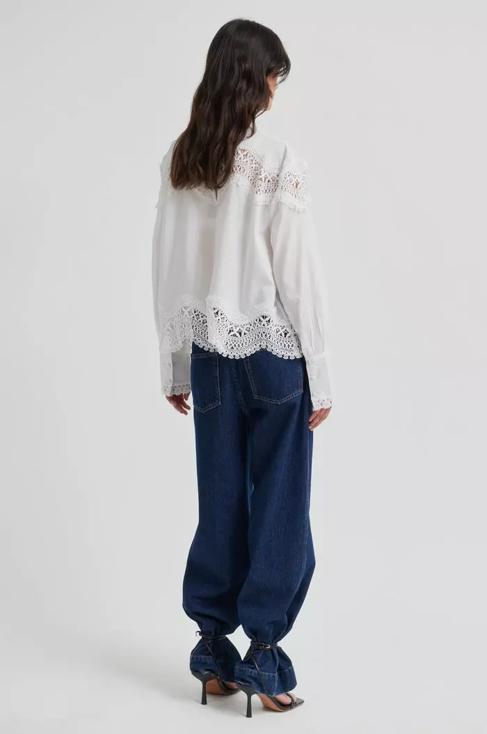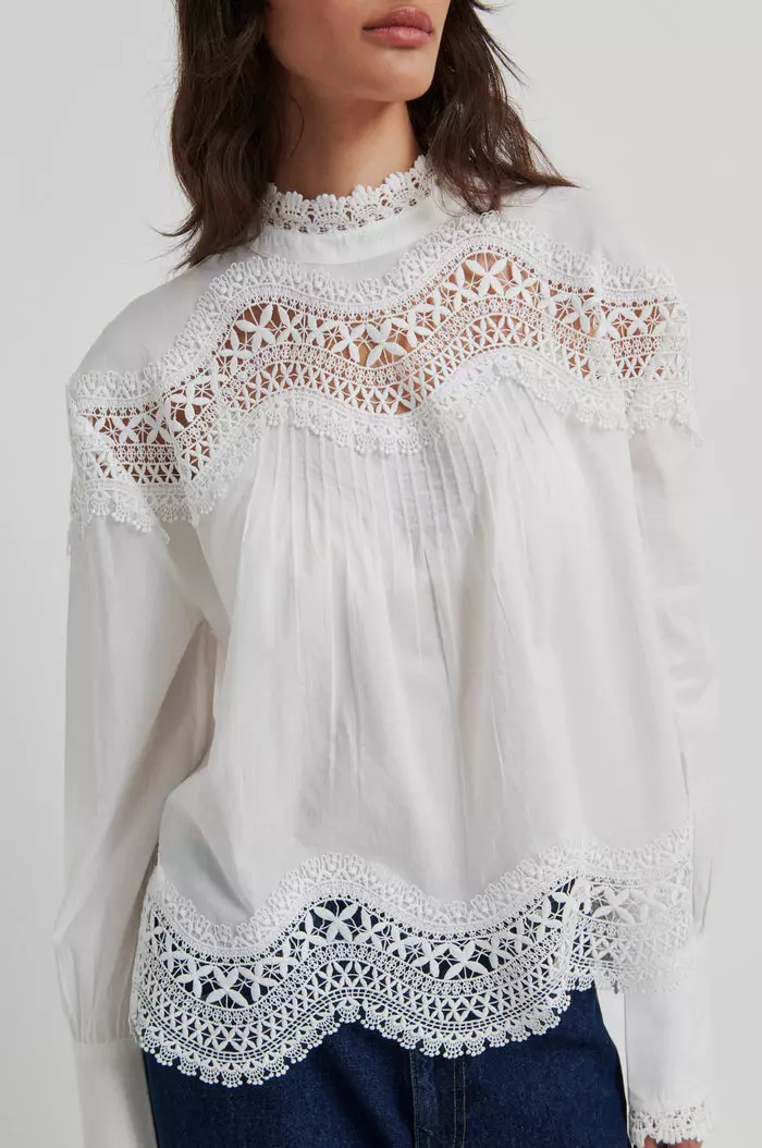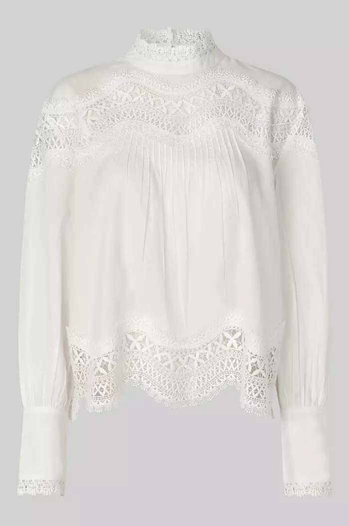 Bluse med blonder fra Second Female. Blusen er laget i glatt, lett bomull med gjennomsiktige blondedetaljer. Har en høy rund hals med knappelukking bak. Lange ermer med knapper i mansjettene. Kamskjellformet kant nederst. Løs og luftig passform.