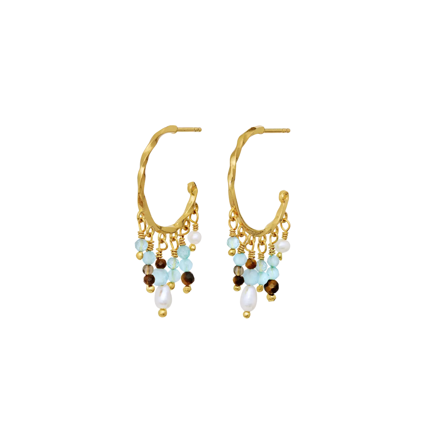 Øredobber med hengende perler og stener i hvit, blå og brun. Like fint til hverdags som til fest.